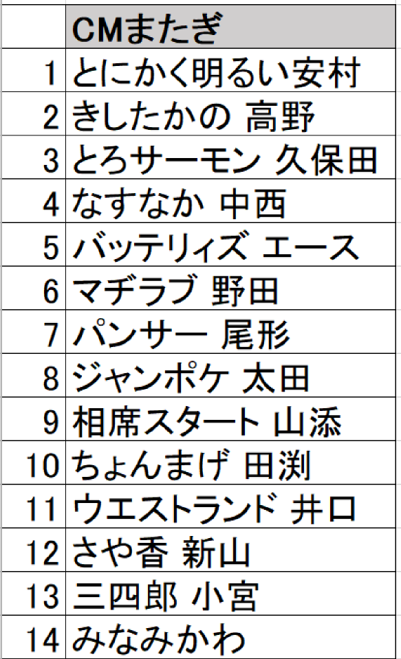 CMに入る前と後に出ていたかどうかのランキングです。チャンネルを変えてもらわないために重要です。