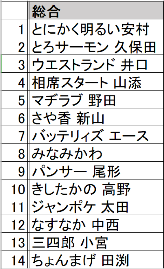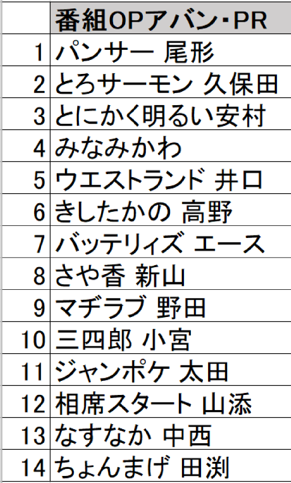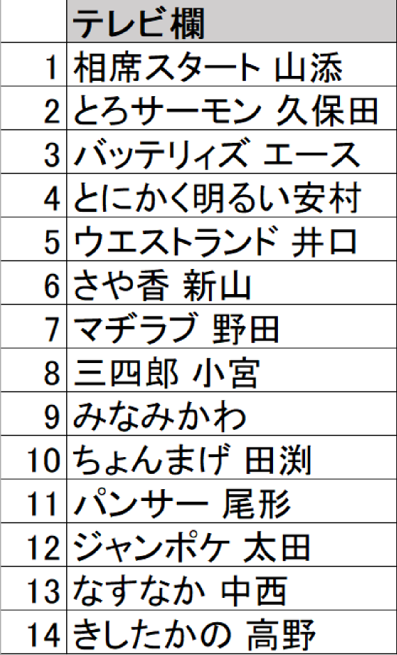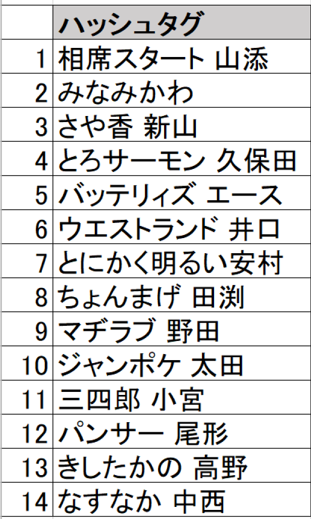 調査対象:相席スタート山添、ウエストランド井口、 きしたかの高野、やさ香新山、三四郎 小宮、 ジャングルポケット太田、ちょんまげラーメン田渕、 とにかく明るい安村、とろサーモン久保田、 なすなかにし中西、バッテリィズ エース、パンサー尾形、 マヂカルラブリー野田、みなみかわ
