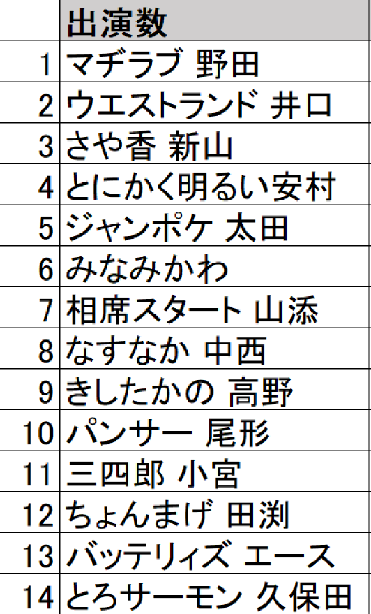 出演した番組で、テレビ欄に名前が乗った確率のランキングです。
