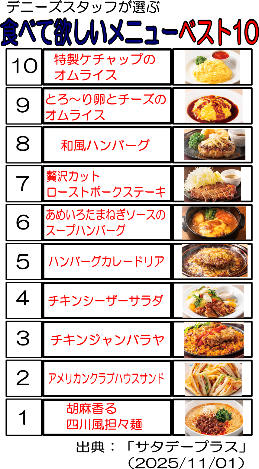 【サタプラ】デニーズのスタッフが選ぶおすすめベスト102025年11月1日【サタデープラス】(2025/11/01放送)でデニーズのスタッフ243人が、ぜひ食べて欲しいと思うメニューベスト10が紹介されたのでまとめました。目次1. デニーズスタッフの食べて欲しいメニューベスト10デニーズスタッフの食べて欲しいメニューベスト10 関連広告 バラエティ,ランキング番組デニーズ,ファミレス,ランキング